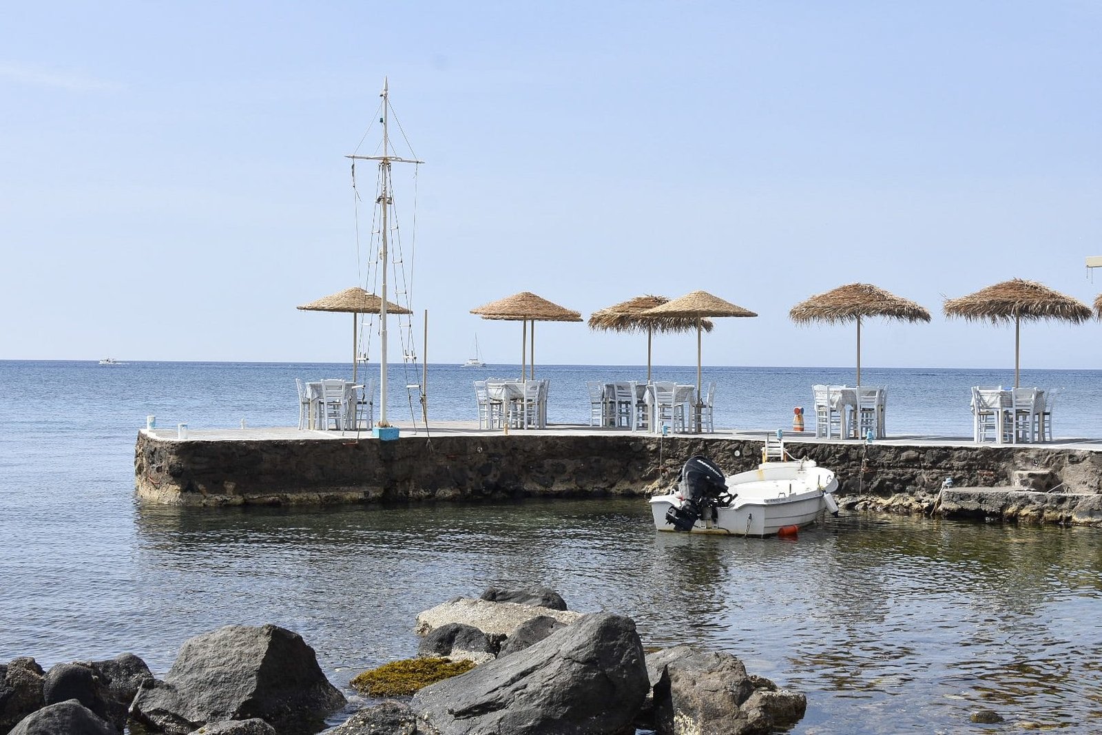 Nous avons passé une journée entière à Perissa. Ici il s’agit d’une plage de sable noir. Elle est bordée par de nombreux restaurants et bars qui proposent des transats. Bon à savoir : vous n’êtes pas obligés de consommer pour vous installer sur les transats. Pour vous y rendre, il y a un bus direct qui part de Fira.